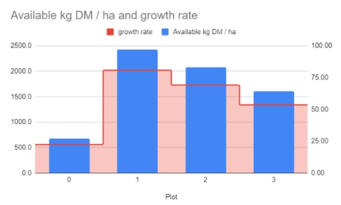 Figure 4. Graph showing amount (in kgDM/ha) of available DM grown between 29 May and 28 June and corresponding grass growth rate (in kgDM/ha/day)