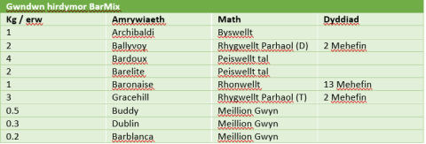 Ffigwr 3a. Manylion y cymysgedd o hadau Gwndwn Hirdymor BarMix a ddefnyddiwyd yn llain 1
