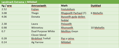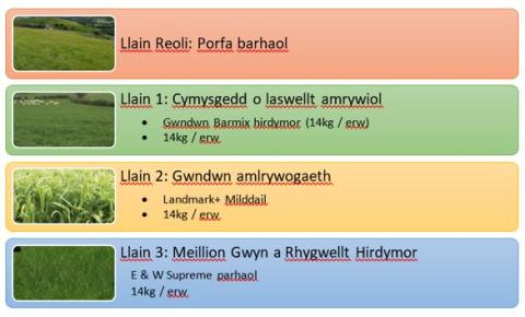 Ni chafodd y llain reoli ei hailhadu ond, yn hytrach, cafodd ei chadw fel porfa barhaol, tra gellir gweld manylion y cymysgeddau a ddefnyddiwyd yng ngweddill y lleiniau yn Ffigur 2.