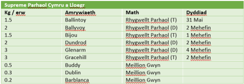 Mae manylion yr amrywiaethau a gynhwysir yn y cymysgeddau hadau uchod ar gael yn Ffigur 3a, 3b a 3c.