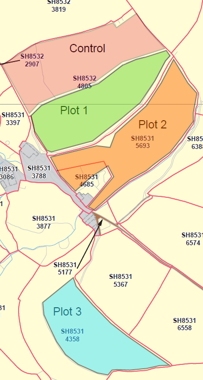 Dewiswyd pedair llain a oedd wedi’u rheoli’n union yr un fath ac yn meddu ar nodweddion tebyg fel y gwelir yn Ffigur 1. Gofynnwyd am Sgrinio Asesiad o’r Effeithiau Amgylcheddol ar gyfer lleiniau 1, 2 a 3 ar 31 Gorffennaf 2023, a rhoddwyd caniatâd i fwrw ymlaen ag ail-hadu cyn pen pythefnos.