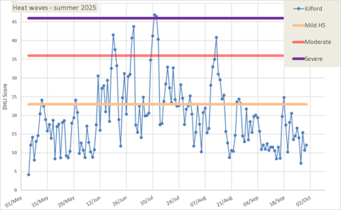 - Gan weithio gyda Dr Tom Chamberlain, cyfrifwyd mynegai straen gwres safonol ar gyfer y cyfnod rhwng 5 Mai a 1 Hydref 2025 (150 diwrnod).