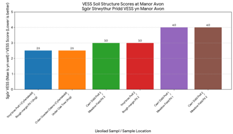 Ffigur 1. Sgôr gwerthusiad gweledol o strwythur y pridd (VESS) ar gyfer gwahanol leoliadau a samplwyd.