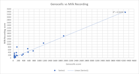 Ffigur 1. Graff Cyfernod Cydberthynas GenoCells yn erbyn Cofnodi Llaeth