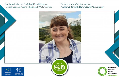 Mae Angharad yn ffermwr defaid a bîff, sydd wedi cymryd rhan mewn nifer o weithdai iechyd a lles anifeiliaid am y sectorau llaeth a chig coch. Mae wedi cynyddu ei hadnabyddiaeth o broblemau iechyd anifeiliaid, gan ddefnyddio ei gwybodaeth newydd ac addasu protocolau fferm i leihau trosglwyddiad clefydau. Roedd ei hymrwymiad cryf i wella effeithlonrwydd a'r ffaith bod y fferm bellach yn brechu ar gyfer BVD yn gyson ac yn profi gwaed am Glefyd Johne o fewn y fuches bîff wedi gwneud argraff ar y panel beirniadu.
