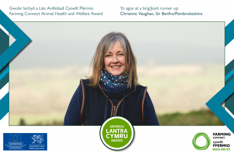 Mae Christine yn ffermwr defaid a bîff. Ar ôl mynychu amrediad o weithdai iechyd a lles anifeiliaid Cyswllt Ffermio, mae bellach yn cydweithio'n agos gyda'i milfeddyg lleol ac mae'n gwneud newidiadau sy'n ei helpu i nodi, lleihau'r risg a rheoli unrhyw broblemau iechyd anifeiliaid. Roedd diddordeb brwd Christine mewn mynychu gweithdai am y diwydiant llaeth a chig coch, gan fanteisio ar y cyfle i weithio gyda'i milfeddyg lleol i gael arweiniad ymarferol ynghylch sut i wneud newidiadau i leihau risg problemau iechyd anifeiliaid amrywiol, wedi gwneud argraff ar y beirniaid. Mae ei sgiliau newydd wedi ei helpu i wneud newidiadau bychain sydd wedi gwella cynhyrchiant ac effeithlonrwydd ar draws sawl maes.