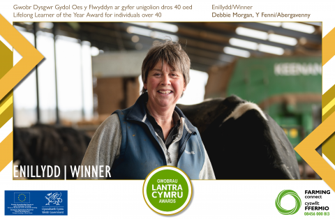 Mae Debbie yn gweithio fel gofalwr y fuches ar uned laeth Holstein o 200 o wartheg cynhyrchiol gyda pheiriannau godro robotig, ac mae'n ffermio ei thyddyn ei hun hefyd ger Y Fenni, sy'n cynnwys buchod sugno. Eleni, mae Debbie wedi cwblhau cyrsiau ynghylch rheoli lloi, Ymgymryd ag AI eich hun a thrimio traed gwartheg.