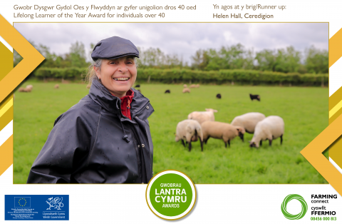 Mae Helen Hall yn newydd-ddyfodiad i fyd ffermio, ac mae'n rhedeg menter ddefaid yn Rhydlewis, Ceredigion. Mae Helen wedi dilyn cyrsiau byr achrededig niferus a hefyd, pob cwrs e-ddysgu am iechyd a hwsmonaeth defaid sydd ar gael trwy raglen Cyswllt Ffermio.