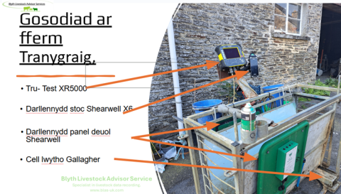 Bu Matthew Blyth o gwmni Blyth Livestock Advisor Services yn gweithio gyda ni ar y prosiect hwn i sicrhau bod y dechnoleg pwyso ac EID a oedd eisoes ar gael ar y fferm yn gweithio’n effeithiol gyda’i gilydd er mwyn rhoi’r prosiect Triniaeth Ddewisol wedi’i Thargedu ar waith, ac i roi sylw i unrhyw broblemau technoleg a oedd yn codi. Roedd y rhestr offer yn cynnwys: