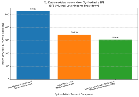 Ffigur 1. Dadansoddiad o Gyfanswm Incwm Haen Gyffredinol (cyfanswm o £1,173.49) y Cynllun Ffermio Cynaliadwy ar gyfer y system goed-borfeydd 4.91ha ar fferm Ty'n yr Onnen (yn ogystal â’r incwm a geir o ganlyniad i gynhyrchiant). Mae’r Taliad Gwerth Cymdeithasol yn gwobrwyo gwytnwch i’r hinsawdd ac opsiynau eraill o safbwynt Rheoli Tir yn Gynaliadwy, mae’r Taliad Fferm Gyfan yn cael ei gyfrifo ar gyfer yr elfen hon ac mae’r Taliad Cynnal a Chadw Coetiroedd ar gyfer rheoli gorchudd coed.