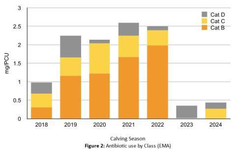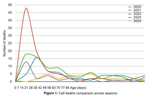 There was a failure of passive transfer (FPT) rate of 31% which accounted for persistently high mortality.  Transition milk was shown to be of variable quality, most significantly reducing towards the end of the calving period when pathogen challenge was increasing.  There was a reduction in morbidity of neonatal calf diseases but most notably NCD (neonatal calf diarrhoea).  Mortality resulting from NCD reduced from an average of 9.5% in the 3 years to 2023 to 3% in 2023 and 2024.  There was an overall reduction in antibiotic use but most notably a cessation in use of HPCIA’s. Calves fed higher quality transition milk had increased liveweight gain.