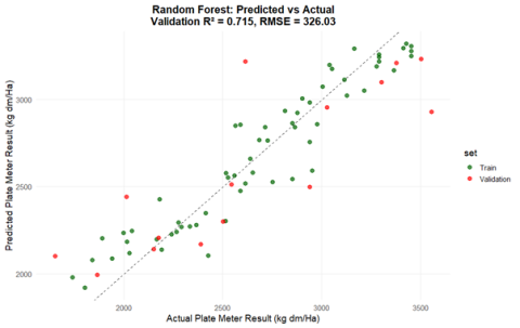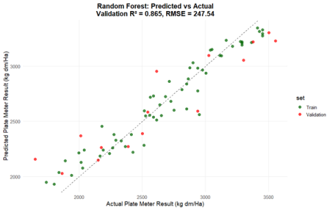 • Data from RGB images (an image where each pixel is defined by the amount of red, green, and blue colours) produced generally weaker models but can still achieve reasonable predictions of plate meter readings (±325 kg DM/Ha).