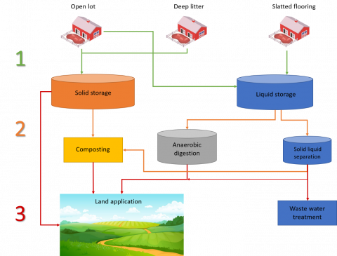 The production of N2O is more common in solid manure than slurry, as bacteria can access oxygen and more solid matter. The level and type of emissions will depend heavily on management methods as there is the opportunity for the release of GHGs at every step, be that during storage or application (Figure 3). After collection, manure is stored either as a liquid (from open units or those with slatted flooring) or as a solid (from deep littered or open lots), solids may then be applied straight to the land, or processed further (Figure 3). The most popular processing methods are anaerobic digestion (AD) or composting, although in some instances liquid and solids are separated before applying the solid fraction to AD (Figure 3).