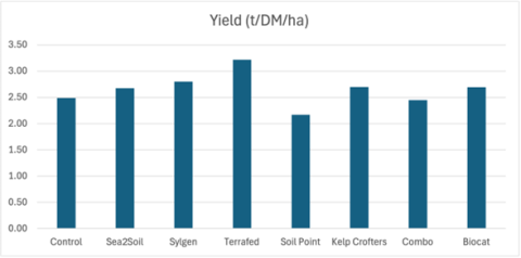 Yield increases were generally small and variable, with Kelp Crofters the most consistent performer, achieving yield gains at two farms and maintaining higher dry matter yields overall.