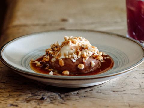 Chocolate cremeux - malt ice cream - single malt Welsh whisky PGI and cherry caramel